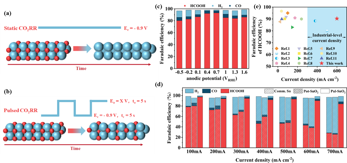 随着二氧化碳(CO2)浓度的持续升高,其对全球环境的负面影响日益凸显。电化学二氧化碳还原反应(CO2RR)作为一种绿色转化途径,能够将 CO2 转化为高附加值化学品,因而受到广泛关注。在 CO2RR 中,催化剂的性能在很大程度上决定了整个系统的产物选择性、能量效率与长期稳定性。例如,SnO2 因其出色的析氢反应抑制能力,被认为是高效制备甲酸盐的优良催化剂。然而,在 CO2RR 反应过程中,SnO2容易发生自还原生成Sn,导致其催化活性与选择性显著衰减。因此,开发兼具高选择性与高活性的Sn基催化剂,对于推动 CO2RR 技术的实际应用具有重要意义。