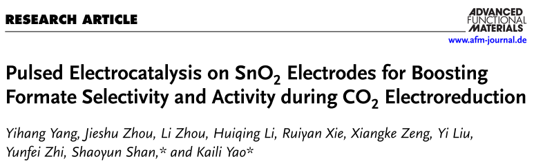 近日,昆明理工大学化学工程学院林资源高效转化与利用创新团队在二氧化碳还原(CO2RR)催化剂研究领域取得重要进展,相关成果以“Pulsed Electrocatalysis on SnO2 Electrodes for Boosting Formate Selectivity and Activity during CO2 Electroreduction”为题发表在材料科学领域顶级期刊《Advanced Functional Materials》(IF=19.0)上。昆明理工大学化学工程学院为论文第一完成单位,我院2023级硕士研究生杨一航为论文第一作者,陕绍云教授和姚凯利老师为论文共同通讯作者。