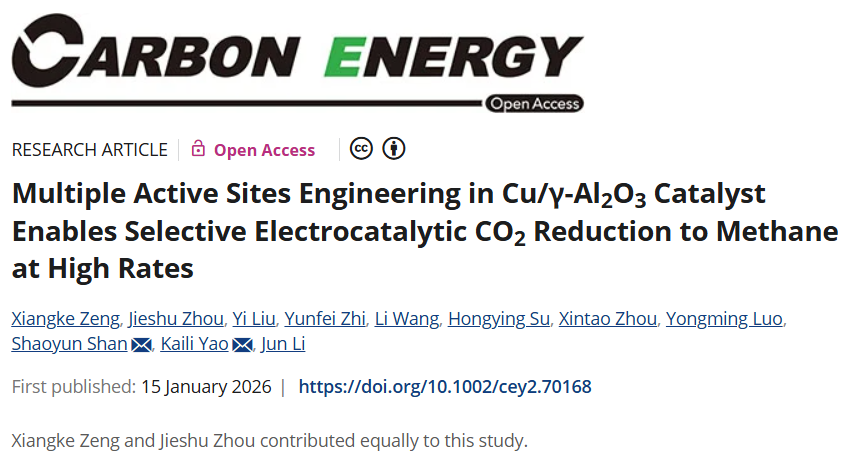 近日,昆明理工大学化学工程学院林资源高效转化与利用创新团队在CO2甲烷化研究领域取得重要进展,相关成果以“Multiple Active Sites Engineering in Cu/γ-Al2O3 Catalyst Enables Selective Electrocatalytic CO2 Reduction to Methane at High Rates”为题发表在材料能源领域顶级期刊Carbon Energy(IF=24.2)上。昆明理工大学化学工程学院为论文第一完成单位,我院2023级博士研究生曾祥棵为论文第一作者,陕绍云教授和姚凯利博士为论文共同通讯作者。